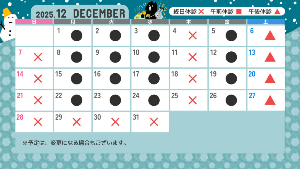 << 12/28(日)~1/4(日)年末年始休診のお知らせ
